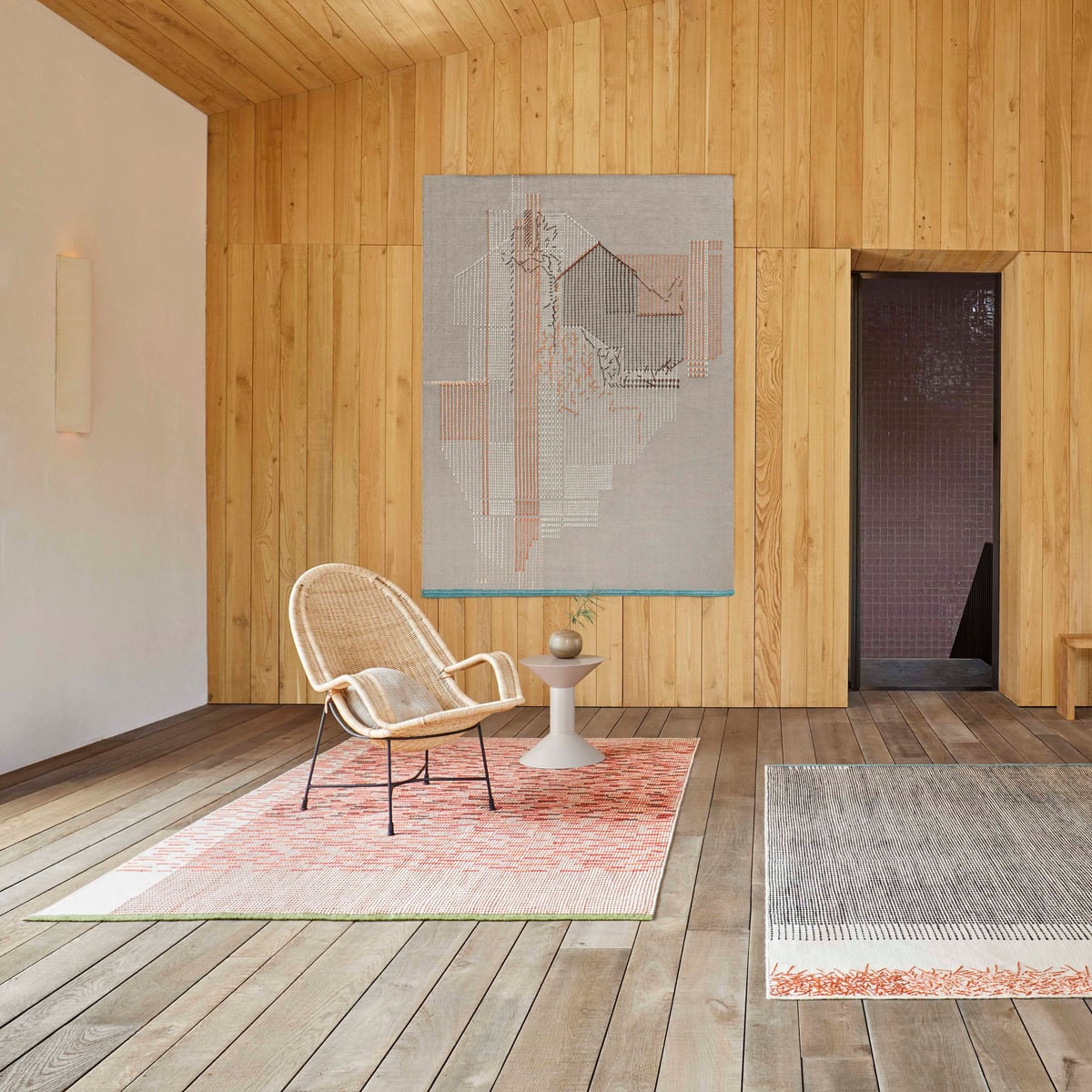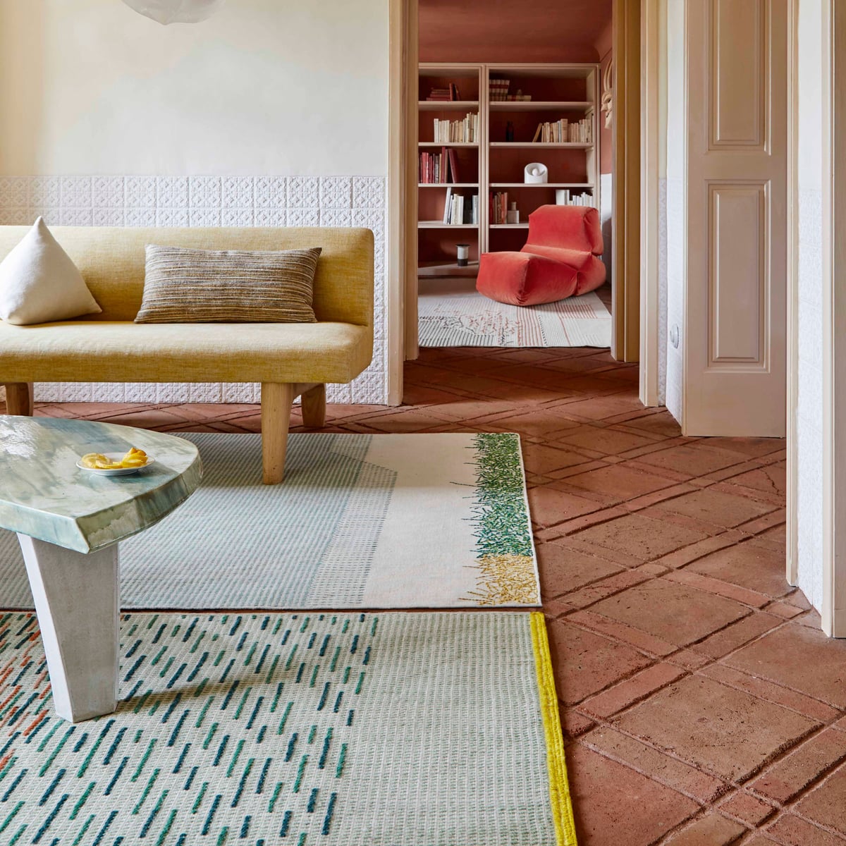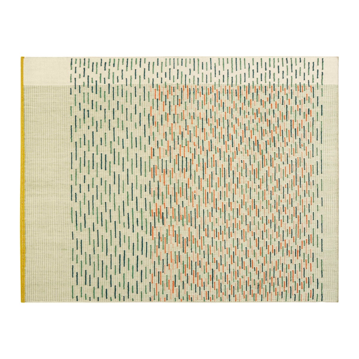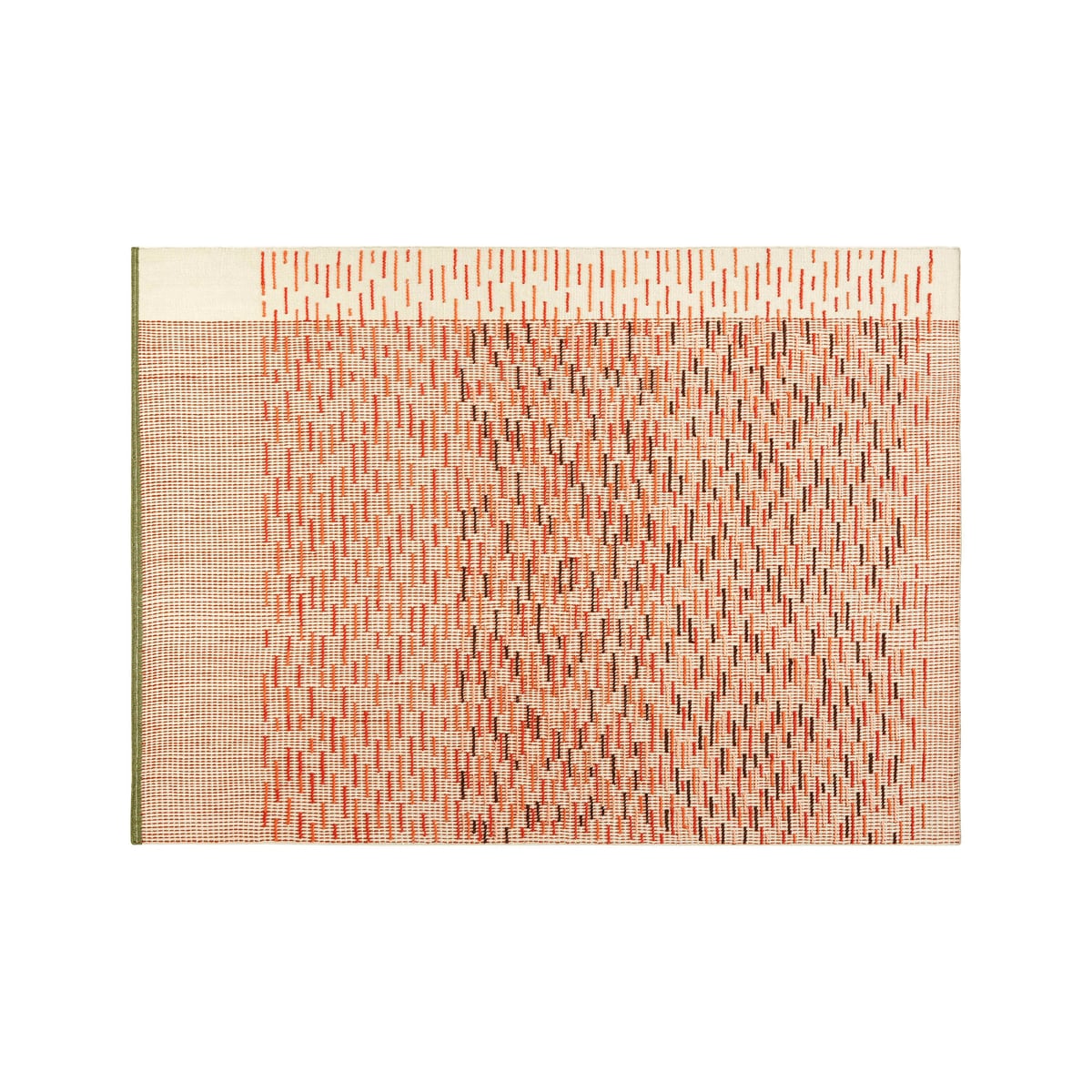 Backstitch Busy Rug - Handmade Wool Area Rug in Green or Brick - Image 1