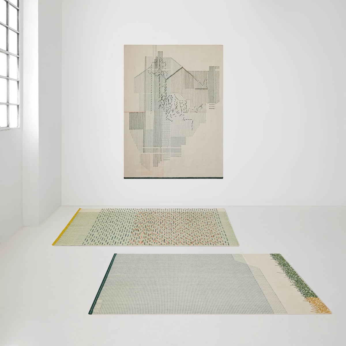 Backstitch Busy Rug - Handmade Wool Area Rug in Green or Brick
